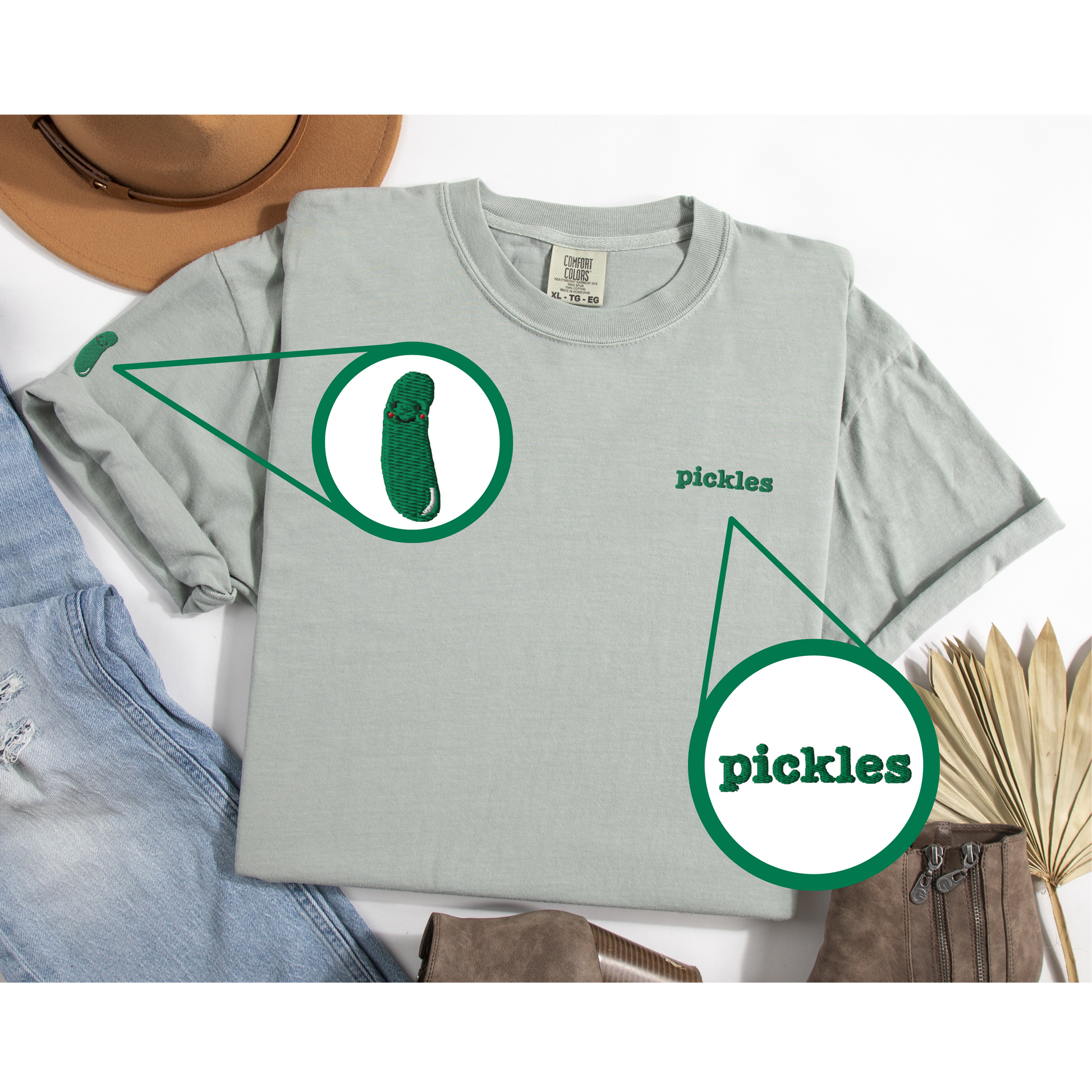 For the pickle lovers out there—this Embroidered Pickles Comfort Colors® Unisex T-shirt is the perfect mix of trendy and cozy! Featuring a minimalist "pickles" embroidery on the left chest and a cute embroidery pickle design on the right sleeve. This oversized, unisex tee is a must-have for pickle enthusiasts and anyone who loves unique embroidered apparel.