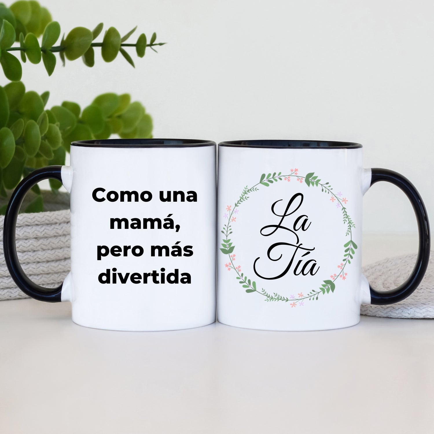 The ultimate mug for the auntie with personality! One side reads “La Tía” and the other says “Como una mamá, pero más divertida”—a playful twist on a classic role that’s sure to make her smile with every sip.