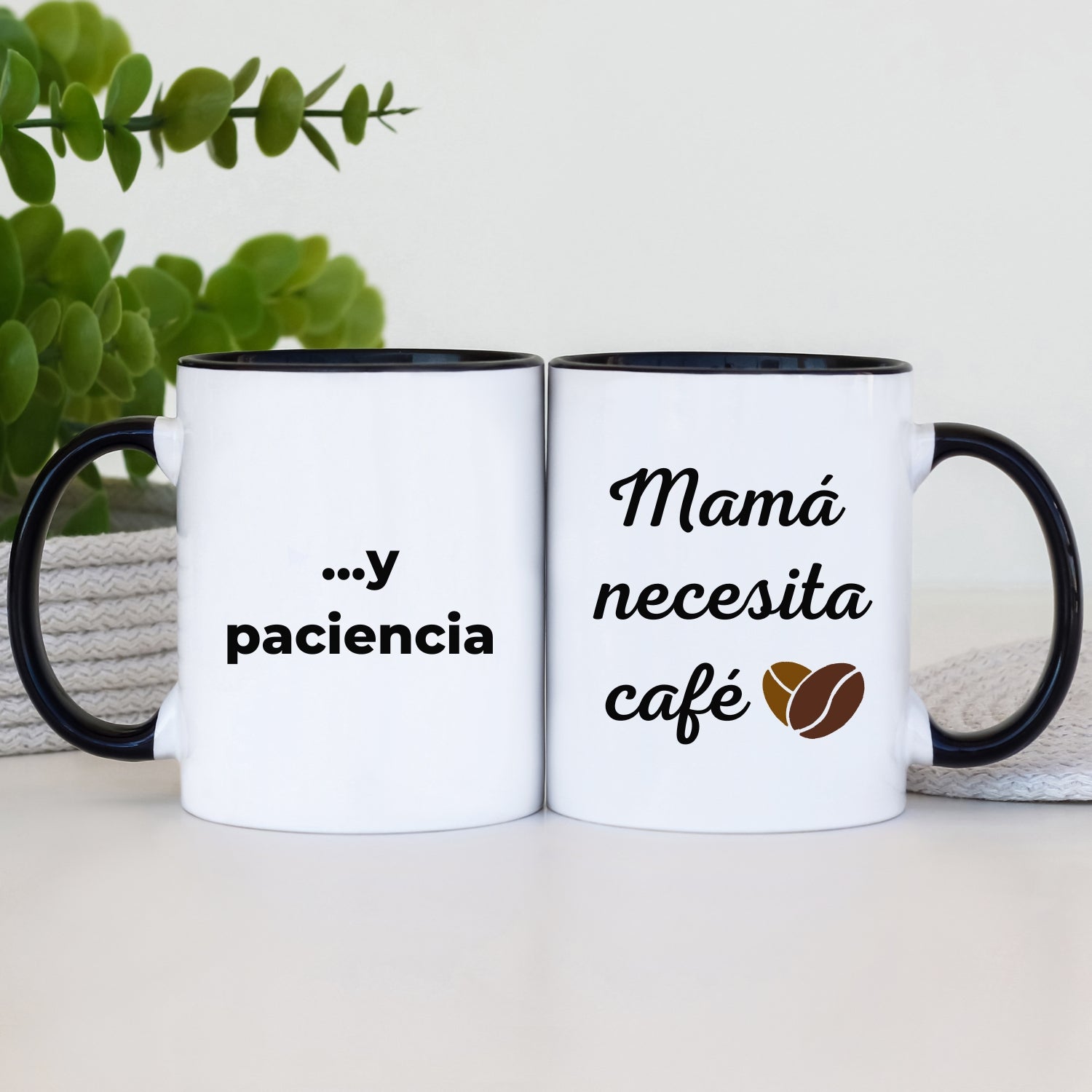 One side features the phrase “Mamá necesita café”, while the other side finishes the thought with “…y paciencia”—relatable, right?